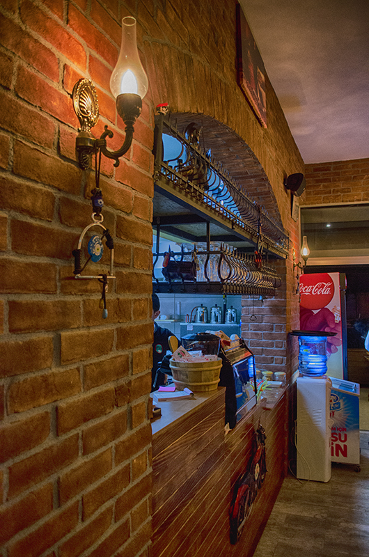 Üstteki fotoğrafta duvarda yer alan bir niş içerisindeki aydınlatma ise eski bir kıyma makinesidir. İşletme sahiplerinin fikirleri doğrultusunda bu üründe Parlak Aydınlatma atölyesinde oluşturulmuştur.